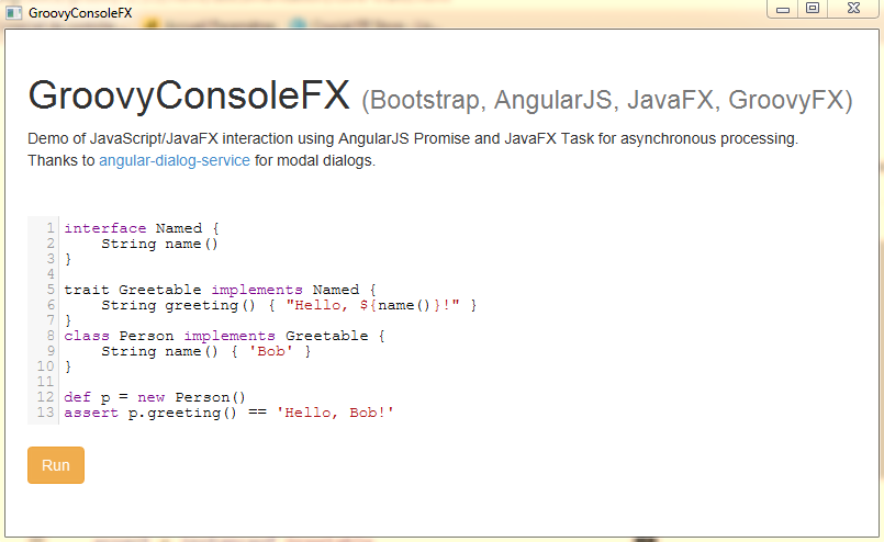 C'est ce que je vais démontrer dans le reste de cet article, en utilisant GroovyFX pour créer l'application JavaFX sous la forme d'un script Groovy. Pour la partie web, qui consiste en un fichier .html chargé dans un composant JavaFX WebView, je recours à AngularJS et son service $q qui implémente les promises. Il serait tout à fait possible d'utiliser jQuery et son implémentation des promises à la place.