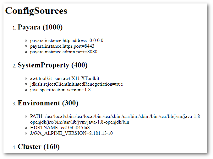 Si vous déployez l'application microprofile-config dans une instance locale de Payara Micro, et accédez à l'URL http://localhost:8080/microprofile-config/resources/configSources, vous obtiendriez une page listant les sources de configuration avec leurs propriétés.